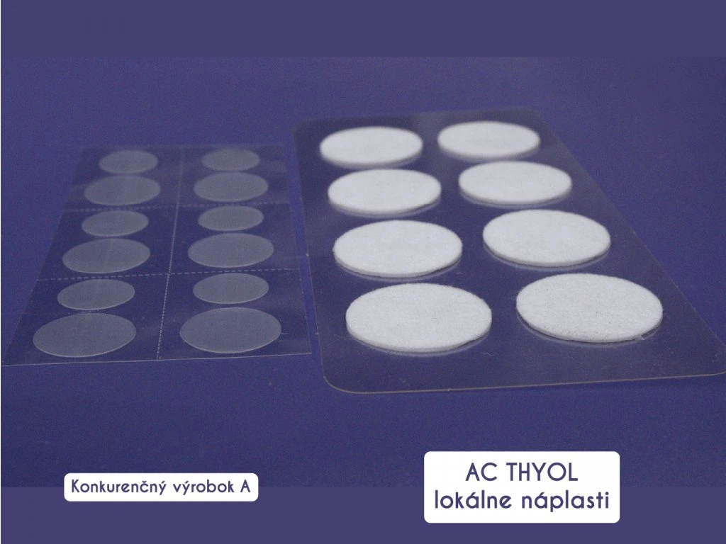 AC Thyol Patch je hydrogélová náplasť určená na liečbu vyrážok. Obsahuje aktívne zložky hydratujúce pokožku až po dobu 8 hodín. Unikátne zloženie dopomáha k liečbe bakteriálnych a mykotických infekcii v postihnutej oblasti. Redukuje množstvo vyrážok a kožného mazu (sébu) v postihnutej oblasti, pričom pokožku hydratuje a ochladzuje. Okrúhla náplasť vytvára fyzickú bariéru a zabraňuje tak infekcii. Najlepšie výsledky sa dosahujú pri liečbe cez noc. (pre viac informácií navštívte: https://www.naplastiplus.eu/faq/)